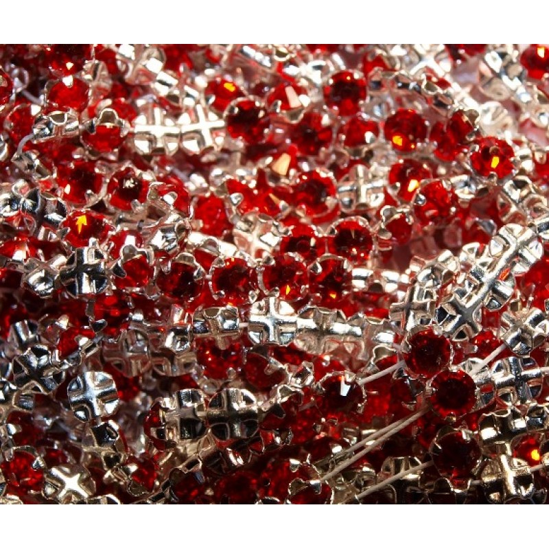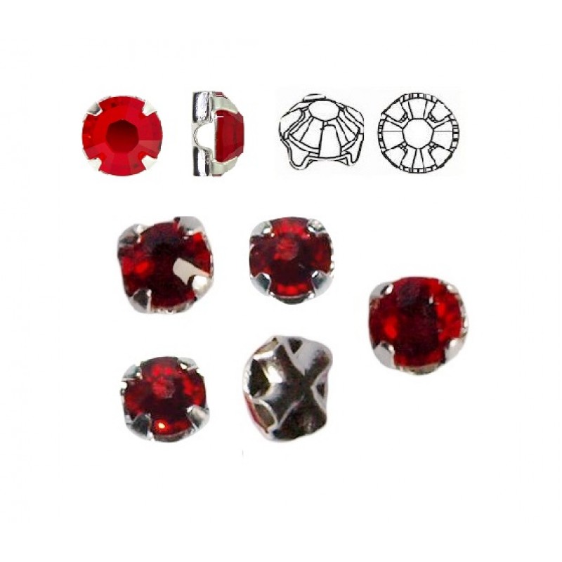 3.00-3.20 mm SWAROVSKI ELEMENTS gaiši sarkanas krāsas kristāli metāla ietvarā. Ietvaram aizmugurējā daļā četri caurumi divos dažādos virzienos. Sudraba pārklājums.