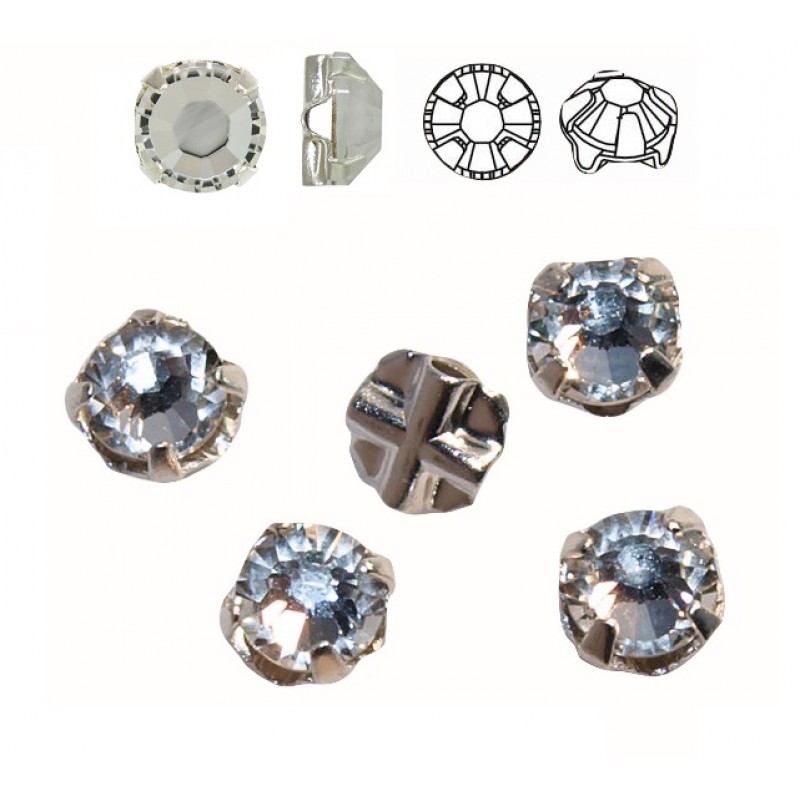 3.8-4.00 mm SWAROVSKI ELEMENTS naturālas krāsas kristāli metāla ietvarā. Ietvaram aizmugurējā daļā četri caurumi divos dažādos virzienos. Sudraba pārklājums.