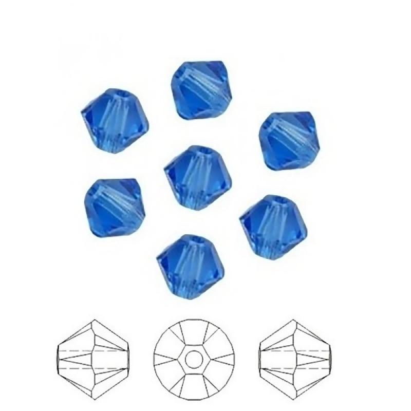 Safīrzils SWAROVSKI bikonuss, caurspīdīgs, ar SWAROVSKI kristāliem raksturīgo mirdzumu. Cena par 10 kristāliem.