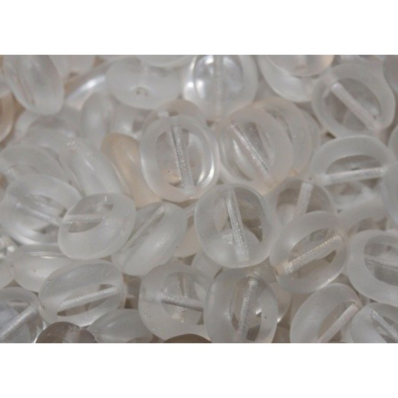 Caurspīdīga, matēta stikla pērle ar divām skaldītam virsmām. Izmērs 10x9mm, cena par gab.