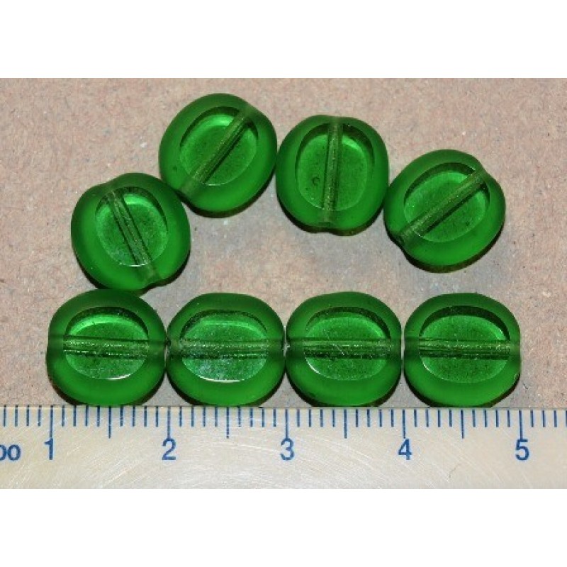 Matēta, zaļas krāsas stikla pērle ar divām skaldītām virsmām, caurspīdīga. Izmērs 10x9mm. Cena par gab.