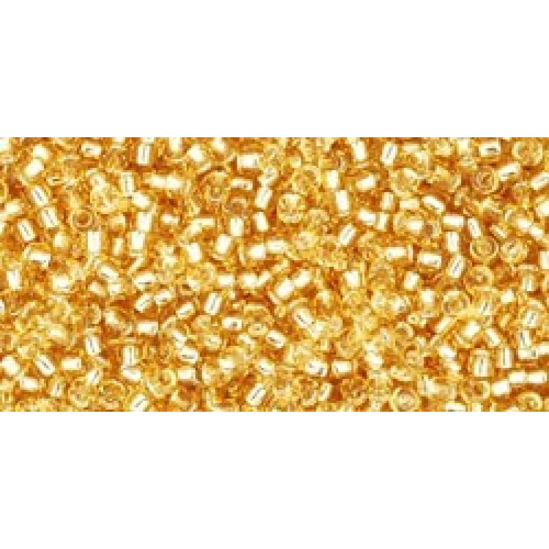 Caurspīdīga, ļoti maza (aptuveni 1.5 mm diametrā) stikla pērlīte gaiša topāza krāsā ar folliju. Pērlīšu vēršanai izmanto Nr. 13 adatas. Personīgi man šo pērlīšu krāsa atgādina zelta krāsu. Jebkurā gadījumā, izskatās ļoti greznas.