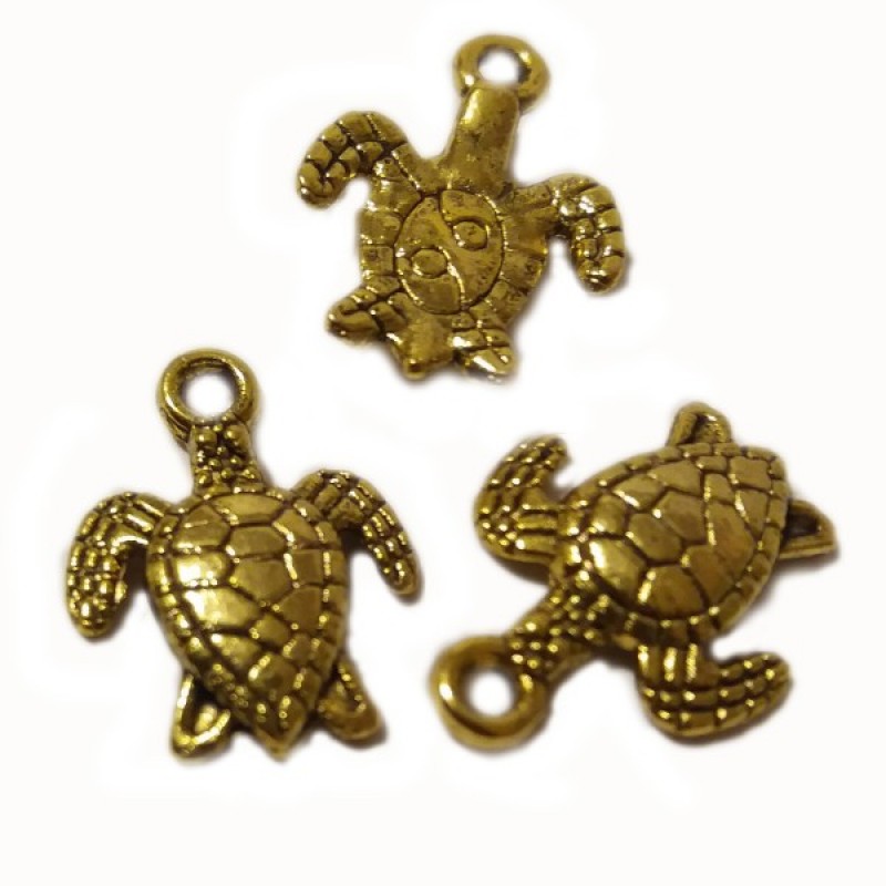 Divpusējs Tibetas stila metāla elements piekariņš bruņurupuča formā. Zelta krāsā, izmērs 12mm, biezums 2mm. Cena par gab.