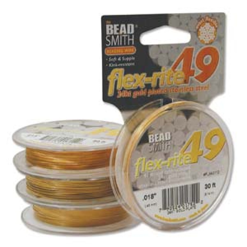 Nerūsējošā tērauda profesionālā juvelieru trosīte. 49 dzīslu pinums ar 24K zelta pārklājumu, pārklāts ar caurspīdīgu neilonu. Flex-rite 49 dzīslu trosīte ir izturīga, mīksta un lokana, noturīga pret mezglošanos. Lai izvairītos no lūšanas, iesakām stiepli nesiet mezglā, bet izmantot spiedītes.