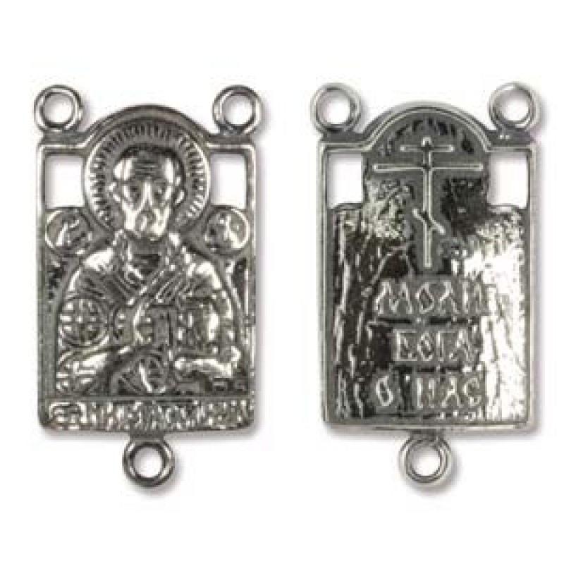 Rožukroņa savienojuma elements, izmērs 20x12mm. Aversā Sv.Nikolajs, reversā - pareizticīgo krusts un teksts "Моли Бога о нас" (Lūdz par mums Dievu). Sudrabs, 925.prove, svars 2.39g. Cena par gab.